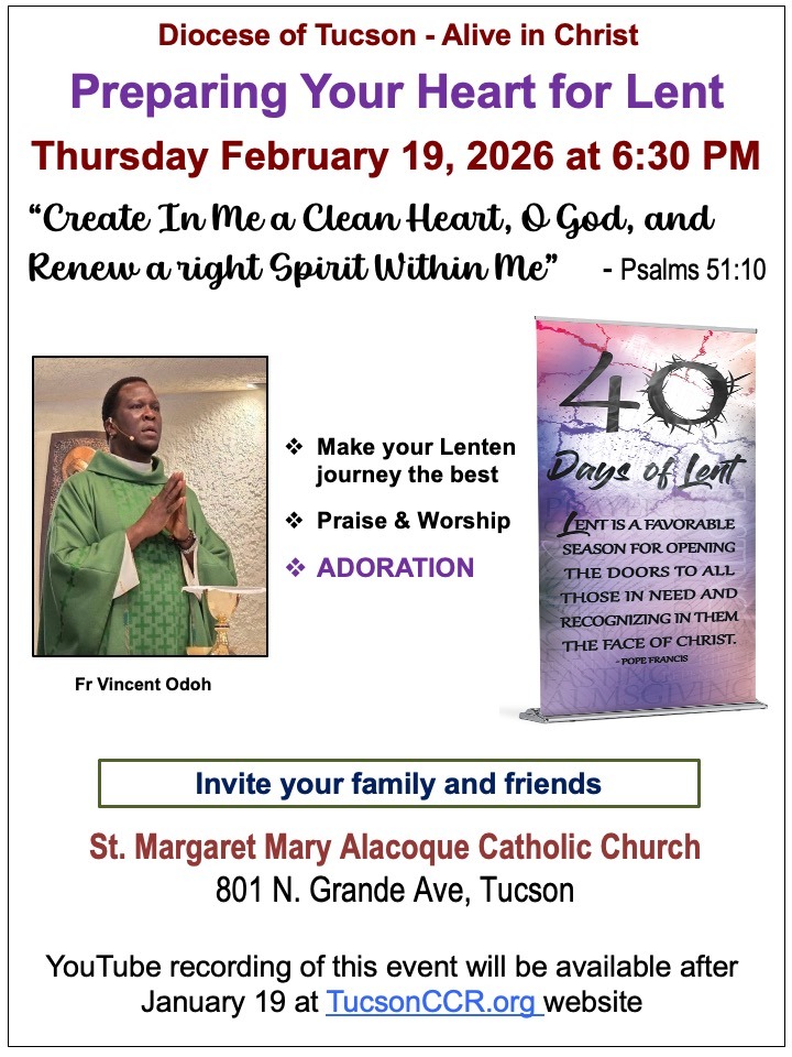 The Catholic Charismatic Renewal of the Dioceses of Tucson (CCRDT) has as its priority, the Evangelization and Catechesis of all the Vicariates that are part of our local Church. We found that there is a need to integrate the different gifts of the Holy Spirit for a more effective service. “United for the Glory of God” is our principal objective for the Spiritual growth of the people of God in our diocese